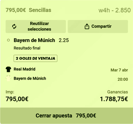 Esta jugada fue cubierta antes del segundo partido. Resto los 2.617,07 € utilizados.