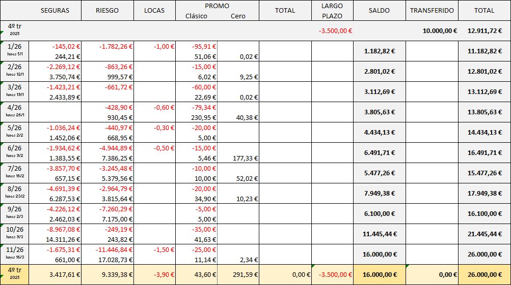 Empieza el trimestre con un saldo 12.911,72 €, en máximo absoluto. Además tengo 4 apuestas a largo plazo en la recámara.