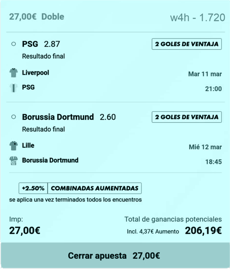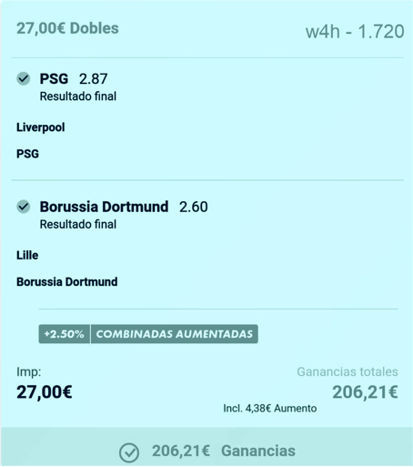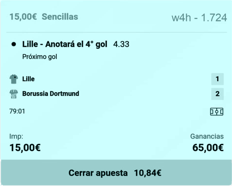 Finalmente esta apuesta resultó ser innecesaria. El Burussia Dortmund ganó y me llevé la apuesta dejando el saldo en: