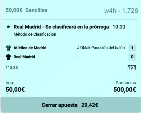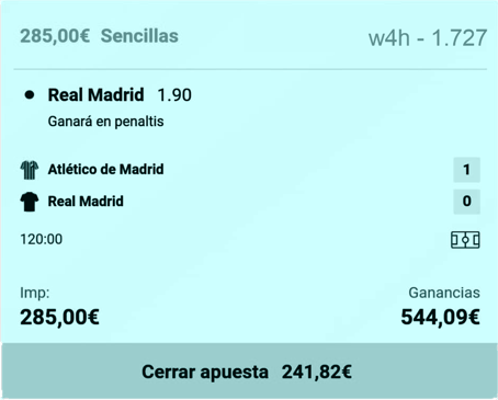 En la primera parte, la clasificación del Real Madrid se pagaba a 1,60. En cuanto marcase el Atlético de Madrid esta cuota subiría por encima de los 2,00 acercándose incluso a 3,00 si es en la segunda parte.