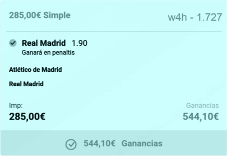 Si uno de los dos se pagara 0,05 mas que el otro apostaría ahí. Pagándose igual opto por el Real Madrid porque, por decirlo de alguna forma, si pierdo me duele menos. Tratándose de un equipo que me ha dado tanto dinero con sus victorias, va a fastidiarme menos si su eliminación me quita un poco de lo que me ha dado. Por tanto es una decisión puramente emocional, y obviamente una Apuesta Riesgo porque desde mi punto de vista una tanda de penaltis es puro azar. Mi jugada es de 285 €.
