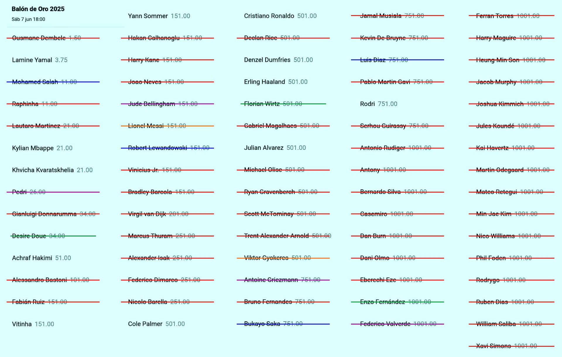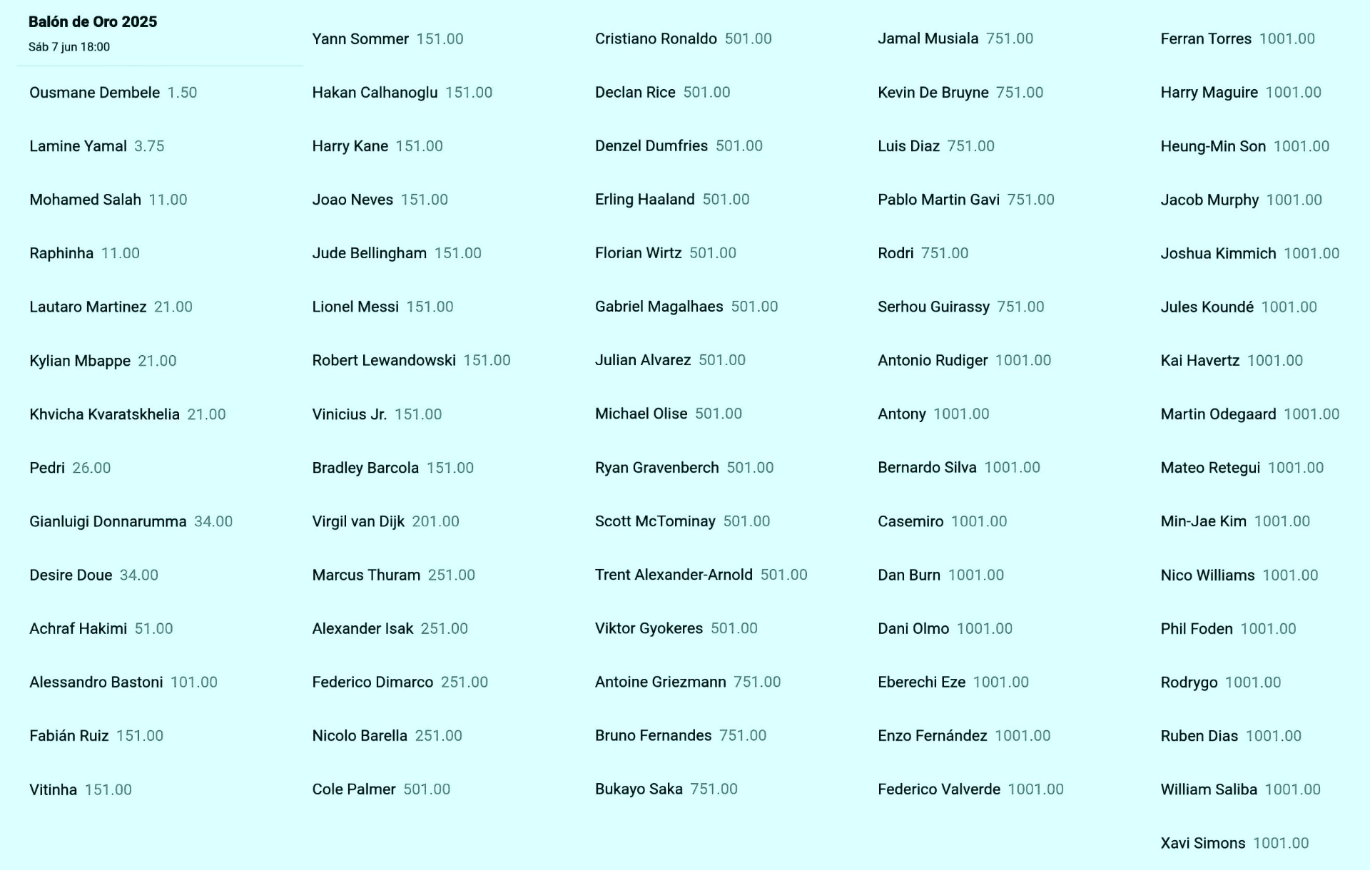 - Lamine Yamal: Quizá haya sido el mejor de la temporada el que más apetece ver y un jugador que con su naturalidad y su sonrisa, conecta con el público perfectamente. El balón de oro sería un justo premio a la temporada que ha hacho. Opino, como apostador, que su cuota no merece la pena. La Nations League son dos partidos (tal vez uno) y después de ella, sus rivales van a seguir acumulando argumentos para el galardón mientras que él va a estar de vacaciones. Mi conclusión, sería un justo ganador, pero creo que no le toca este año.