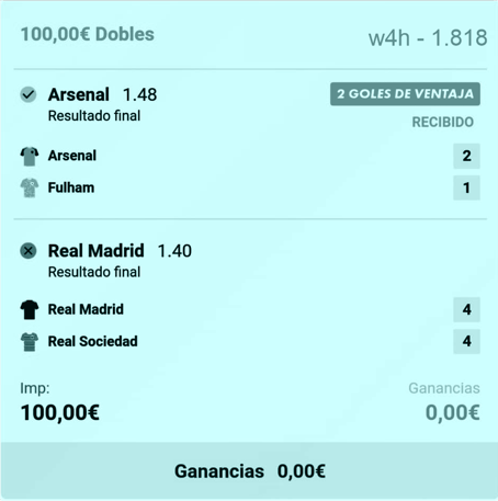 Este es un formato de apuesta que me gusta mucho. Cubre la primera (gracias a la oferta de 2 goles de ventaja) y da opción a acertar ambas.