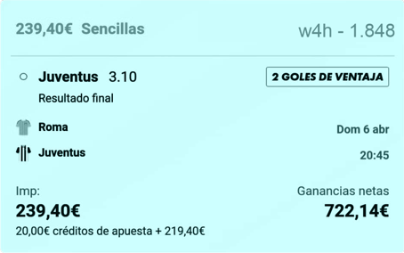 - Dejar la Apuesta a ver si marca la Juve para ganar los 722 € limpios (ya que ya he recuperado la inverisón inicial).
