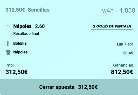 - Dejar la Apuesta a ver si marca el Nápoles para ganar los 812,50 € limpios (ya que ya he recuperado la inverisón inicial).