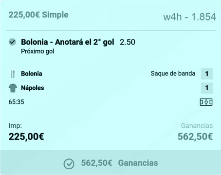 - La buena, la que visto el partido debí haber elegido. Abandonar al Nápoles y jugar los 500 € a victoria del Bolonia o empate: Esto me daba un beneficio total (quitanto todos los gastos) de 787,50 € en caso de victoria local o empate.