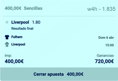 Y decido mi apuesta, hay varios candidatos pero elijo el Liverpool. No tiene Champions y la cuota es muy positiva. El problema es que juega el domingo y tengo que esperar, no obstante opino que merece la pena y realizo esta jugada: