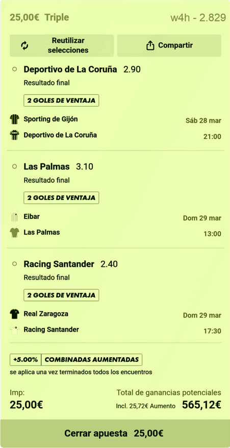 El primero es el Deportivo de la Coruña. Muy bien pagado contra un rival tremendamente irregular.El segundo es la Unión Deportiva las Palmas. Buen equipo, viene en buena racha. Es especialmente fiable como local, pero ...